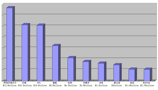 油漆涂料頂級品牌公司整合并購加劇,并加速亞洲市場的開發(fā),尤其是中國市場,阿克蘇諾貝爾牢牢占據(jù)領(lǐng)先位置,居全球的第1,得益于收購帝國化學(xué)ICI,雖然在出售了英國涂料公司王冠crown。PPG收購式馬卡龍進(jìn)一步鞏固了市場地位。RPM加大內(nèi)部品牌整合力度。鉆石涂料在收購四季涂料和弗羅斯特涂料,排名躍居世界的第9。世界十大油漆涂料品牌公司排名:表1