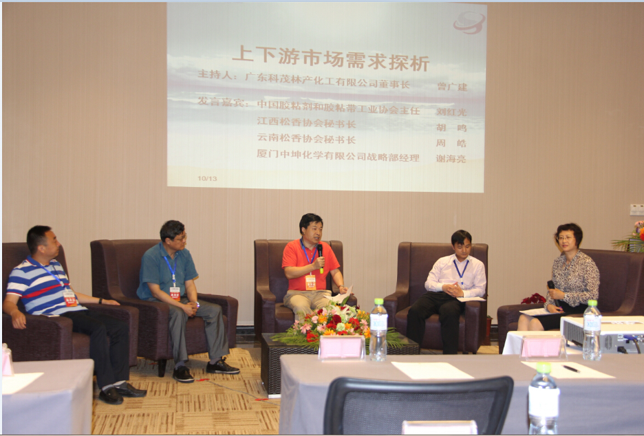 接下來是分論壇二《上下游市場需求探討》,由廣東科茂林產(chǎn)化工有限公司董事長曾廣建主持,中國膠粘劑和膠粘帶工業(yè)協(xié)會主任劉紅光、江西松香協(xié)會秘書長胡鳴、云南松香協(xié)會秘書長周皓、廈門中坤化學(xué)有限公司戰(zhàn)略部經(jīng)理謝海亮擔任發(fā)言嘉賓,他們就2016年上下游市場對松香/松節(jié)油及其深加工產(chǎn)品需求情況去分析、預(yù)判市場,讓參會代表看到了當前行業(yè)市場需求情況。最后主持人總結(jié)說:就市場需求,我們也不要太悲觀,今年松香市場也有利好因素,一是減產(chǎn)的預(yù)期;二是 “一帶一路”項目建設(shè)正在如火如荼進行中;三是國家多項政策擴大內(nèi)外需求、提振經(jīng)濟;四是房地產(chǎn)多項舉措去庫存;這系列有利因素都將能帶動市場需求的。