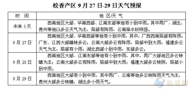 華訊松香網(wǎng)溫馨提醒:未來三日,各主產(chǎn)區(qū)以多云伴陣雨或小到中雨天氣為主,局部地區(qū)出現(xiàn)降溫現(xiàn)象。隨著季節(jié)推進(jìn),各產(chǎn)區(qū)天氣逐漸轉(zhuǎn)涼,晝夜溫差加大,部分采脂工人上山積極性減弱,后期松脂供應(yīng)量或難以放大。另有部分地區(qū)采脂工人下山現(xiàn)象比較明顯,后期松脂下山量或會逐漸減少。