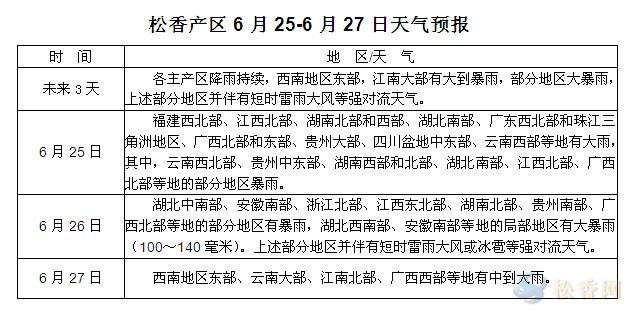 華訊松香網(wǎng)提醒:未來三天各產(chǎn)區(qū)降雨天氣持續(xù),部分地區(qū)強度略有趨弱,但總體未有明顯改觀。近期降雨天氣過于頻繁,端午期間粵桂贛等局地強降水造成的了較嚴(yán)重的洪澇災(zāi)害,受災(zāi)地區(qū)松脂采割及運輸工作將中斷一段時間。從目前天氣情況看,松脂短時間內(nèi)放量的可能性不大,且部分地區(qū)工廠或因脂量偏少略上調(diào)脂價以保證原料供應(yīng)。