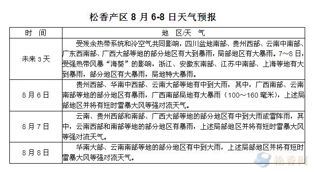 華訊松香網(wǎng)提醒:未來(lái)三天受殘余熱帶系統(tǒng)和冷空氣共同影響,兩廣、云貴等地局部有大到暴雨,松脂采收工作暫難恢復(fù)。另熱帶風(fēng)暴“???rdquo;將登陸東部沿海,江浙皖滬等地受影響。本周各主產(chǎn)區(qū)仍多陣雨天氣為主,且不乏短時(shí)暴雨的等天氣,松脂量方面將難有較大改善,對(duì)于部分前期接有8月份訂單的工廠有一定影響,為保證原料供應(yīng),部分地區(qū)工廠或適當(dāng)調(diào)整松脂收購(gòu)價(jià)格。