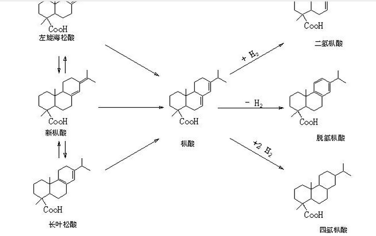 1.反應(yīng)原理松香歧化反應(yīng)是由樹脂酸分子間發(fā)生氫原子的重新分布,使一個(gè)分子析出的氫加于另一個(gè)樹脂酸分子,脫氫和加氫的反應(yīng)結(jié)合起來。因此,歧化反應(yīng)的實(shí)質(zhì)是氧化—還原反應(yīng)(氧化反應(yīng)即脫出氫原子,還原反應(yīng)即得到氫原子),它是氫原子從一個(gè)分子轉(zhuǎn)移到另一個(gè)分子所引起。在松香歧化反應(yīng)時(shí),樹脂酸分子間發(fā)生氫原子的重排,樅酸型的4種樹脂酸(左旋海松酸、新樅酸、長葉松酸、樅酸)通過雙鍵重排而自由異構(gòu),形成對酸和熱最穩(wěn)定的樅酸。一部分樅酸共軛雙鍵上失去2個(gè)氫原子,形成具有穩(wěn)定苯環(huán)結(jié)構(gòu)的脫氫樅酸,另一部分樅酸分子則吸收2個(gè)或4個(gè)氫原子而生成二氫樅酸或四氫樅酸。這兩個(gè)過程同時(shí)發(fā)生,從而完成歧化作用。