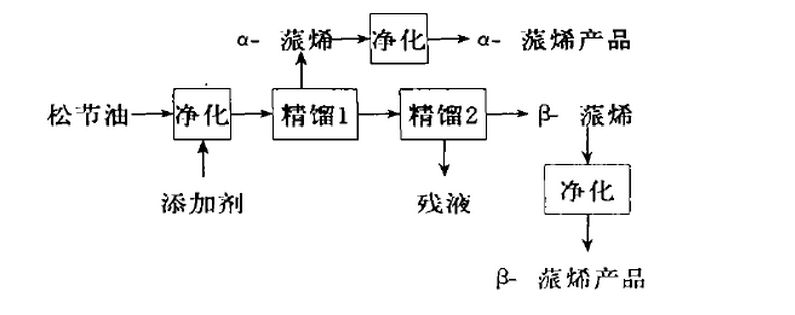 2.共沸精餾 ——采用共沸精餾技術(shù)分離旅烯, 是在松節(jié)油中加入一種添加劑, 利用添加劑分別與α蒎烯和β蒎烯形成共沸物的溫度差進行分離, 工藝流程如下: