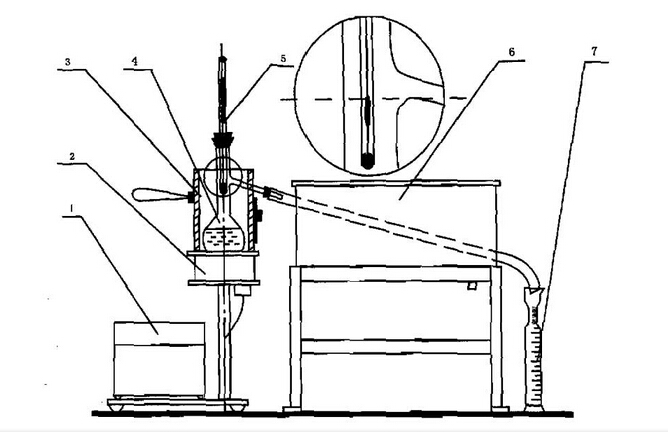 6、初餾點和餾程儀器設(shè)備:(符合SH/T 0121-1992的各項要求)①電器裝置。②電爐。③燒瓶罩。④恩氏蒸餾燒瓶(容量100mL)。⑤溫度計(棒式局浸式有膨脹室的水銀溫度計,范圍140-200℃,分度值0.5℃)。⑥冷凝管。⑦異徑量筒(容量100mL,)。⑧氣壓計。⑨石棉墊。⑩鐵架臺。11秒表。12冷凝器座架。13冷凝器水槽。