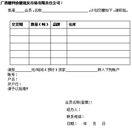 由于我方原因致使我方在特定條件下未能及時(shí)按照《松香預(yù)售合同》第四條有關(guān)規(guī)定通過(guò)貴公司松香電子交易系統(tǒng)進(jìn)行食糖銷(xiāo)售,因此,特委托貴公司通過(guò)我方 會(huì)員號(hào)進(jìn)行代理操作,該操作視同我方交易。我方承諾按照市場(chǎng)《交易規(guī)則》對(duì)此交易行為履行全部職責(zé)并承擔(dān)全部?jī)r(jià)格風(fēng)險(xiǎn)。
